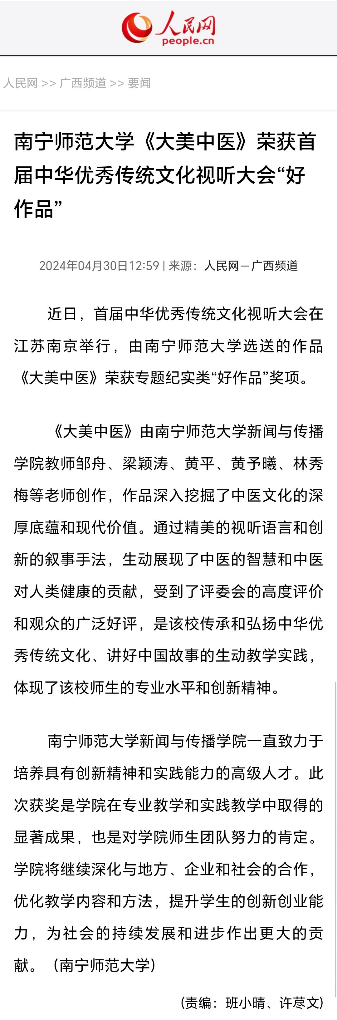 【人民网】南宁师范大学《大美中医》荣获首届中华优秀传统文化视听大会“好作品”