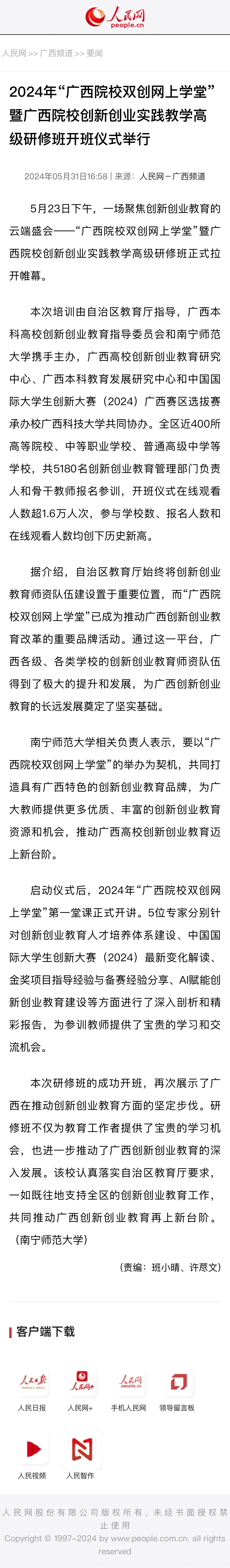 【人民网】2024年“广西院校双创网上学堂”暨广西院校创新创业实践教学高级研修班开班仪式举行