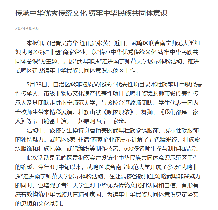 【南宁日报】传承中华优秀传统文化 铸牢中华民族共同体意识