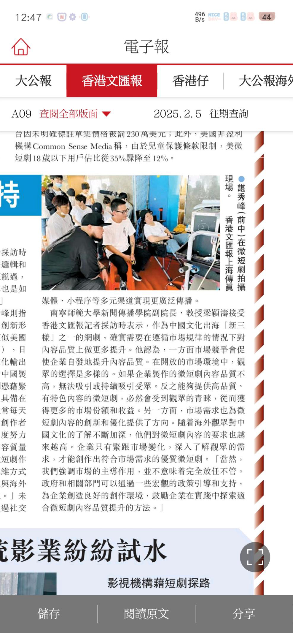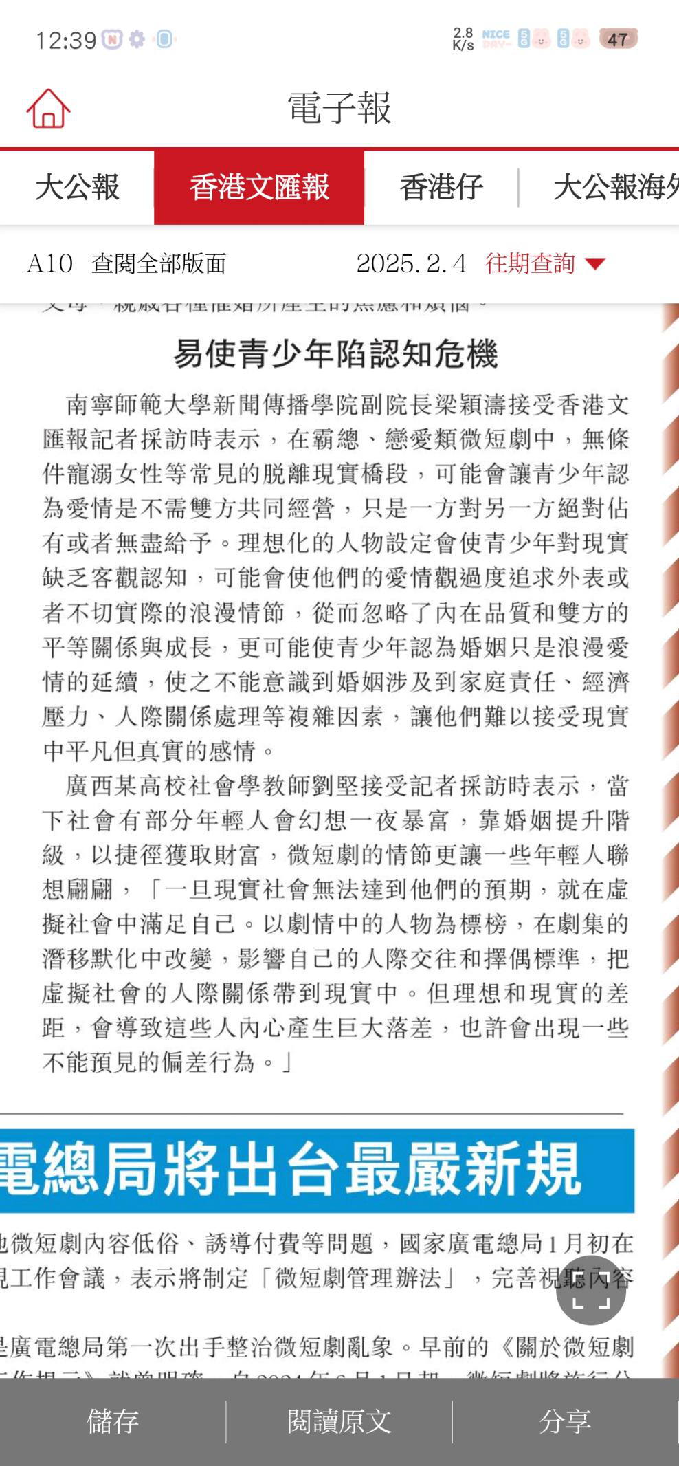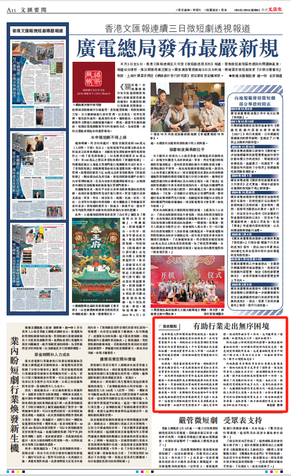 香港文汇报于2025年2月4日至6日连续三天刊发了《微短剧透视系列》报道,深入探讨了微短剧发展过程中所遇到的问题与乱象。新闻与传播学院教授梁颖涛在接受采访时表示,新规的出台将有助于提升微短剧的内容质量,推动行业朝着精品化方向发展。