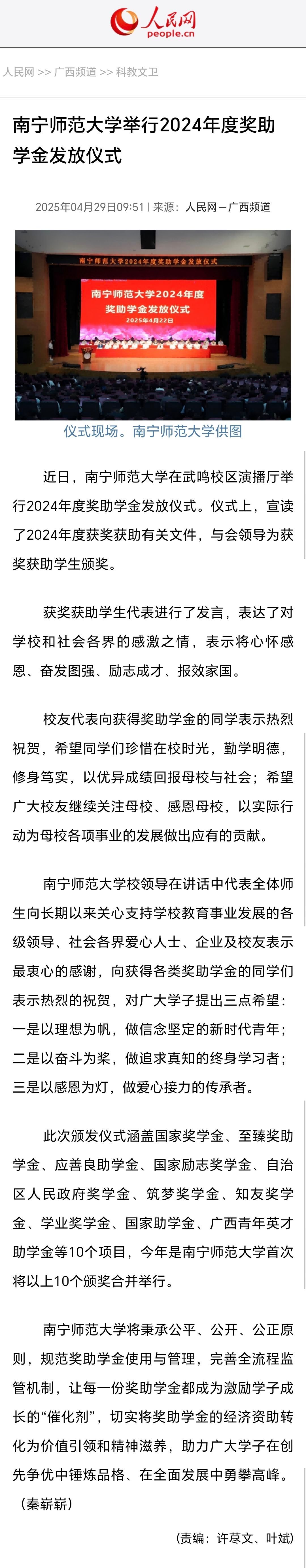 【人民网】南宁师范大学举行2024年度奖助学金发放仪式