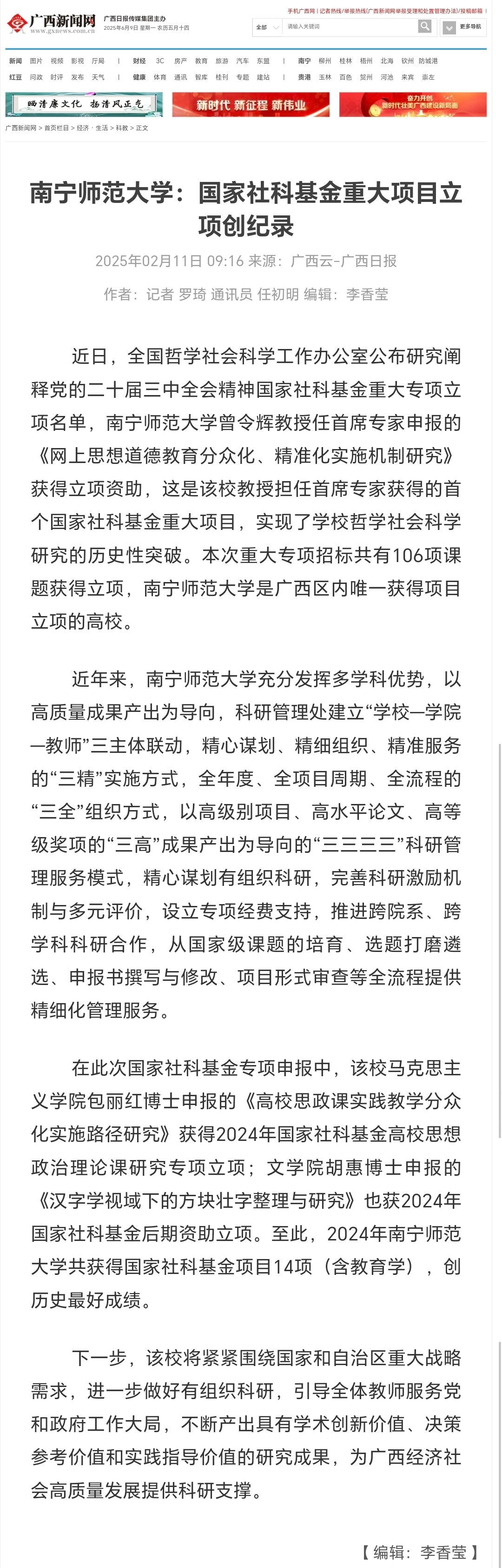 【广西云-广西日报】南宁师范大学:国家社科基金重大项目立项创纪录