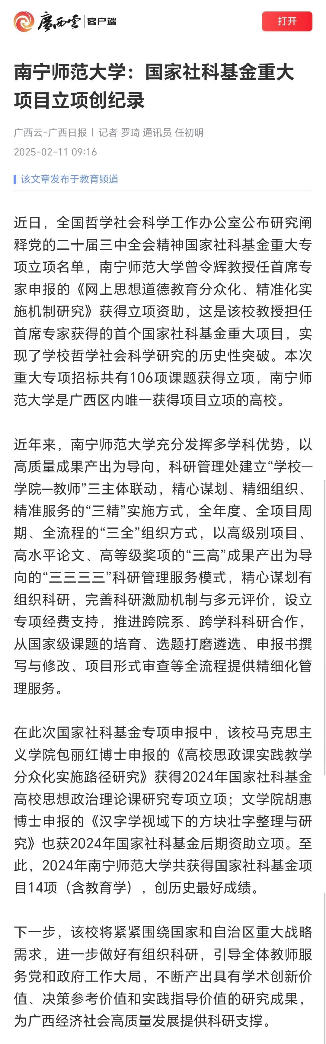 【广西云-广西日报】南宁师范大学:国家社科基金重大项目立项创纪录