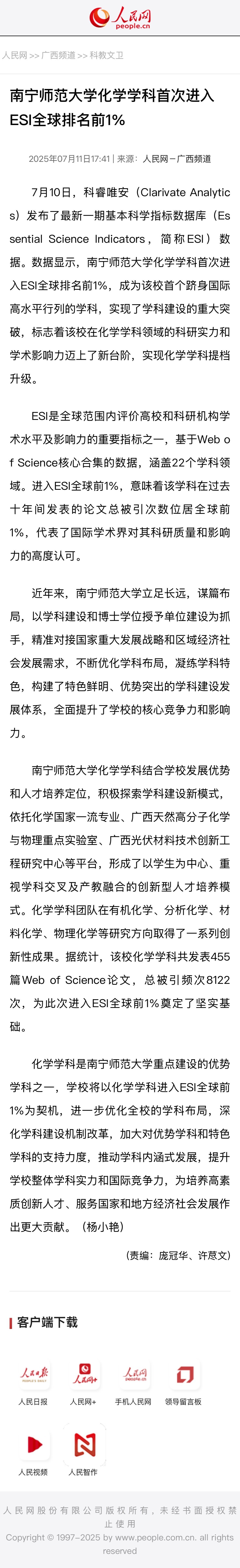 【人民网】南宁师范大学化学学科首次进入ESI全球排名前1%