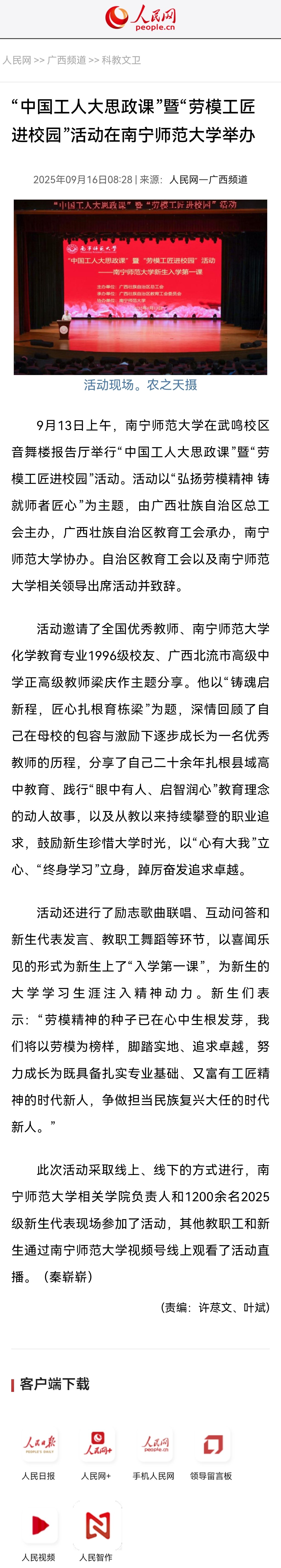 【人民网】“中国工人大思政课”暨“劳模工匠进校园”活动在南宁师范大学举办