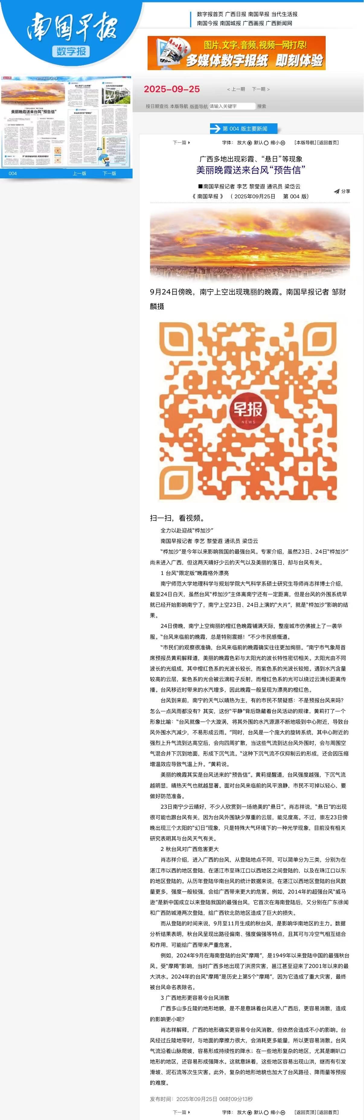 【南国早报】广西多地出现彩霞、“悬日”等现象,美丽晚霞送来台风“预告信”
