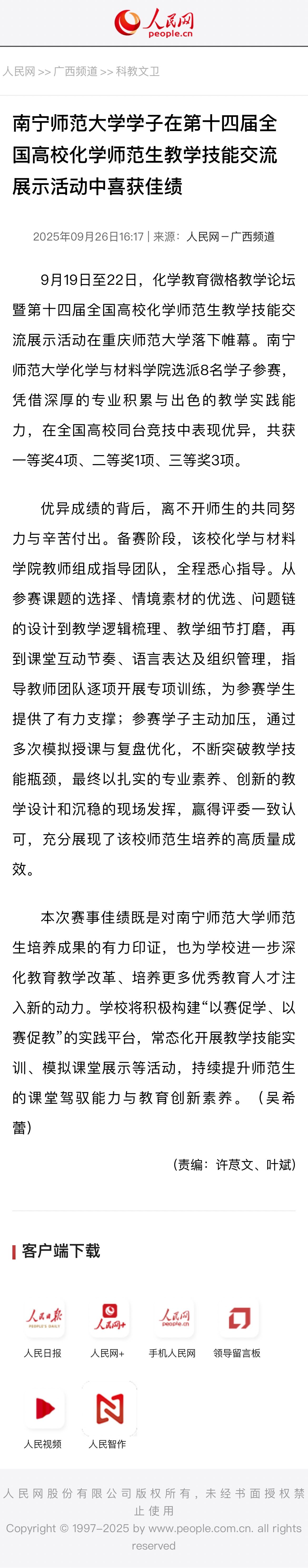 【人民网】南宁师范大学学子在第十四届全国高校化学师范生教学技能交流展示活动中喜获佳绩