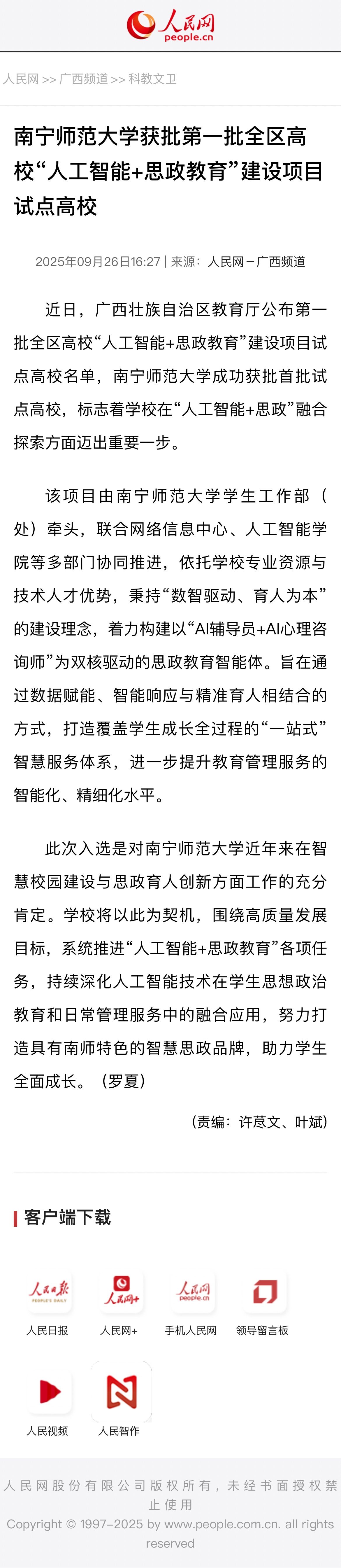 【人民网】南宁师范大学获批第一批全区高校“人工智能+思政教育”建设项目试点高校