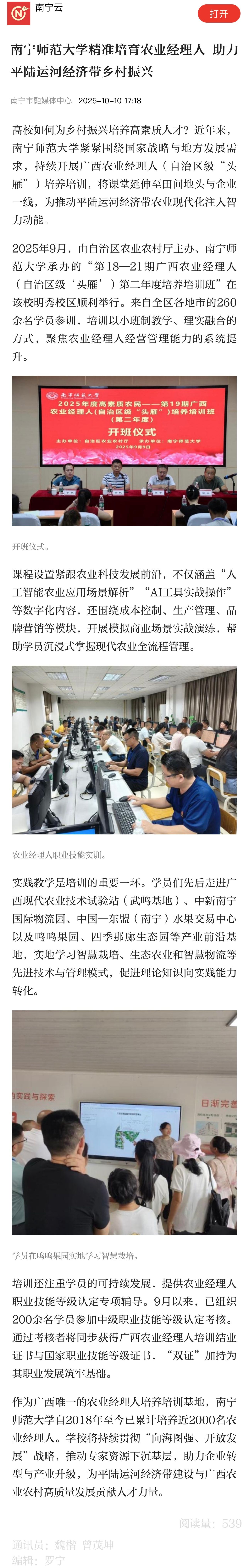 【南宁市融媒体中心】南宁师范大学精准培育农业经理人 助力平陆运河经济带乡村振兴