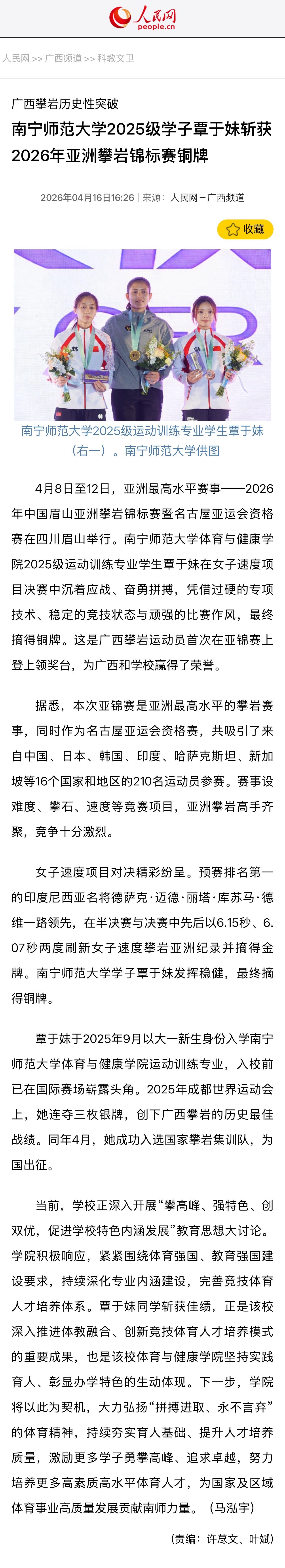 【人民网】完美官方在线入口2025级学子覃于妹斩获2026年亚洲攀岩锦标赛铜牌
