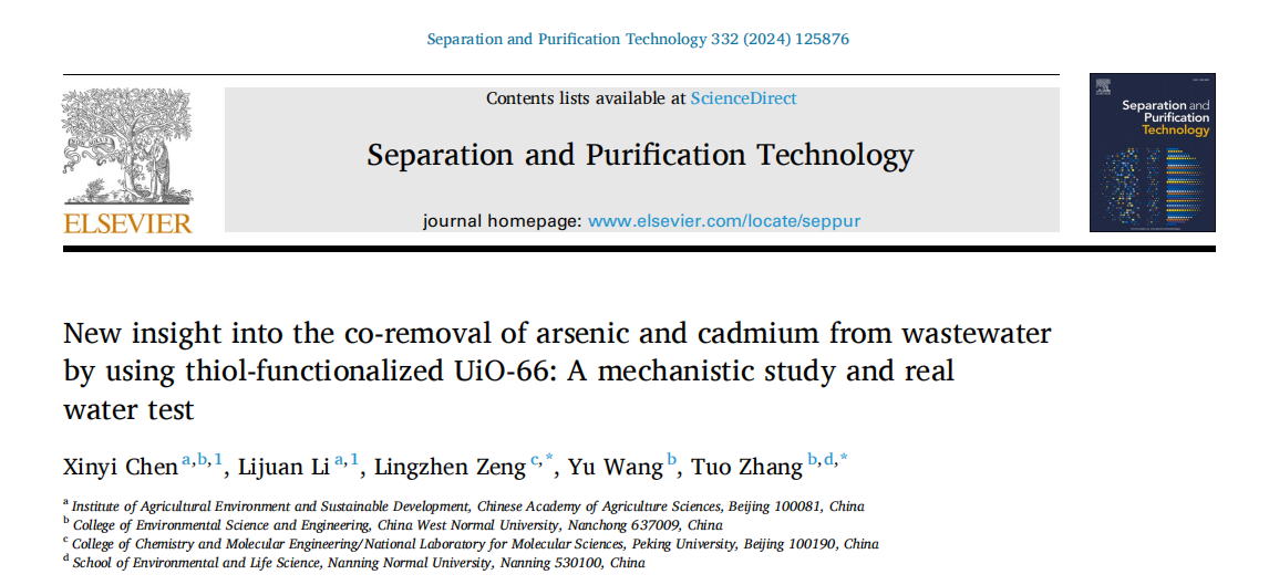近日,我校环境与生命科学学院张拓副教授分别与北京大学、新疆农业大学、中国农业科学院和湖南省农业科学院合作在工程技术/化工领域著名期刊《Separation and Purification Technology》(中科院1区TOP,JCR1区,IF2023=8.1),综合类领域期刊《Scientific Report》(中科院2区,JCR1区,IF2023=3.8)、农业综合领域期刊《AgricultureBasel》(中科院2区,JCR 1区,IF2023=3.3)等著名期刊发表了4篇高水平研究论文。上述文章深度探究了新型环境功能材料UiO-66-SH、海泡石负载纳米零价铁S-nZVI和纳米水铁矿在水体和土壤环境中对砷和镉两种重金属的同步钝化过程机制和重金属污染在土壤长期耕作条件下潜在的迁移释放过程机制。张拓副教授为上述4篇论文的通讯作者,南宁师范大学作为参与单位完成相关研究。上述多项研究工作得到了国家自然科学基金、国家重点研发计划课题、四川省自然科学基金和中央级科研院所基本科研业务费的支持。