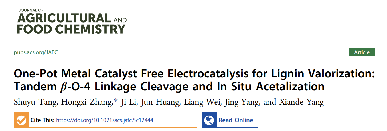 近日,我校化学与材料学院2021级本科生唐树玉同学以第一作者身份在国际权威期刊《Journal of Agricultural and Food Chemistry》(中科院一区Top,影响因子6.2)上发表题为《One-Pot Metal Catalyst Free Electrocatalysis for Lignin Valorization: Tandemβ-O-4 Linkage Cleavage and In Situ Acetalization》的研究论文。南宁师范大学为唯一完成单位,张宏喜教授为论文通讯作者,韦良教授、杨晶正高实验师、黄俊副教授和杨显德博士共同参与了指导,研究成果得到了广西科技重大专项、广西科技计划等项目的支持。这是我校本科生首次以第一作者身份发表中科院一区的高水平论文。