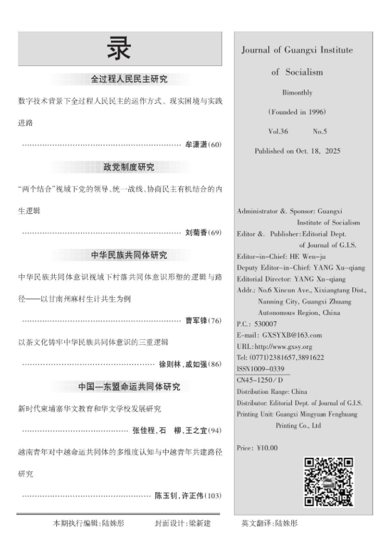 马克思主义学院硕士研究生赴越访学取得扎实的学习成果,在许正伟老师的指导下,2024年赴越访学研修团成员、2023级研究生陈玉钊同学,基于赴越访学期间的社会调研成果,于2025年底在《广西社会主义学院学报》以第一作者身份发表了《越南青年对中越命运共同体的多维度认知与中越青年共建路径研究》一文。