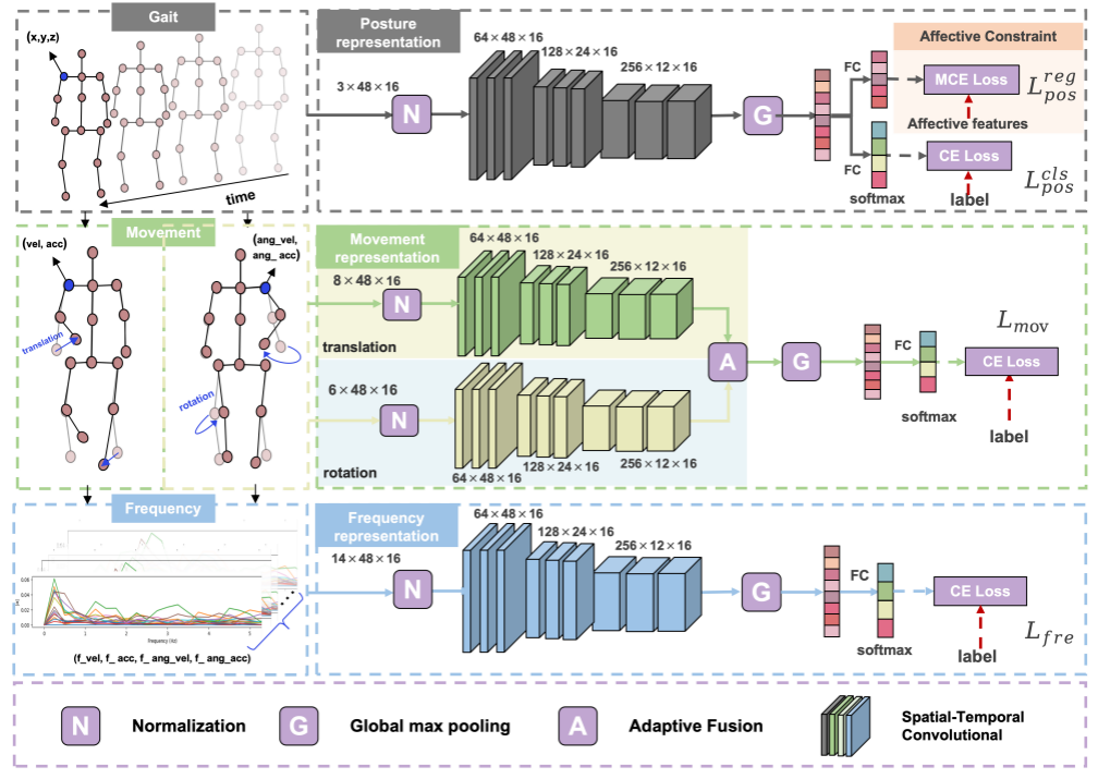 情感计算是人工智能领域的前沿热点,而步态情感识别(GER)因其具有非接触、远距离、保护隐私等独特优势,在老年健康监测、心理健康评估及公共安全等领域具有广阔的应用潜力。然而,现有步态情感识别方法往往未能充分考虑与人类情感密切相关的细微运动线索,导致对情感强度的表征不足;同时,以往研究多局限于时域的局部依赖,忽视了步态作为周期性运动的频域全局特征。因此,如何精准捕捉步态中的深层情感特征成为该领域亟待解决的挑战。