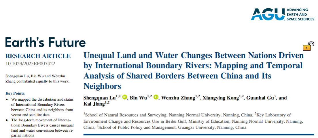 在Earth's Future发表了题为“Unequal Land and Water Changes Between Nations Driven by International Boundary Rivers: Mapping and Temporal Analysis of Shared Borders Between China and Its Neighbors” 的研究论文。论文揭示国际界河水体与陆地之间的动态转换过程,为全球国际界河国家共同管理此类河流及预防潜在冲突提供科学依据。该文由吴彬副教授、张文主副教授为通讯作者,硕士研究生卢盛权为第一作者共同完成。