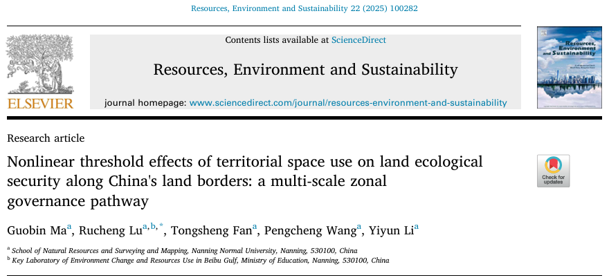 在Resources, Environment and Sustainability发表了题为“Nonlinear threshold effects of territorial space use on land ecological security along China's land borders: a multi-scale zonal governance pathway”的研究论文。论文揭示了中国陆地边境地区国土空间利用对土地生态安全的非线性影响,为全球边境国土空间的协同治理提供一定参考。该文由陆汝成教授为通讯作者,硕士研究生马国斌为第一作者共同完成。