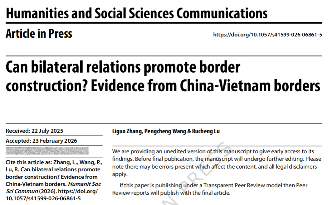 在Humanities and Social Sciences Communications发表了题为“Can bilateral relations promote border construction? Evidence from China-Vietnam borders”。论文揭示了中越边界建设如何响应并与双边关系互动,为促进双边关系可持续发展和高质量边境建设规划提供了科学依据。该文由张利国副教授为第一作者,硕士研究生王鹏程为通讯作者共同完成。