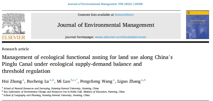 在Journal of Environmental Management发表了题为“Management of ecological functional zoning for land use along China's Pinglu Canal under ecological supply-demand balance and threshold regulation”的研究论文。论文通过构建“供需量化阈值识别分区调控”集成框架,以关键土地利用阈值为切入点,为平陆运河沿线生态功能分区与管理提供参照。该论文由罗蜜博士为通讯作者,硕士研究生钟慧作为第一作者共同完成。
