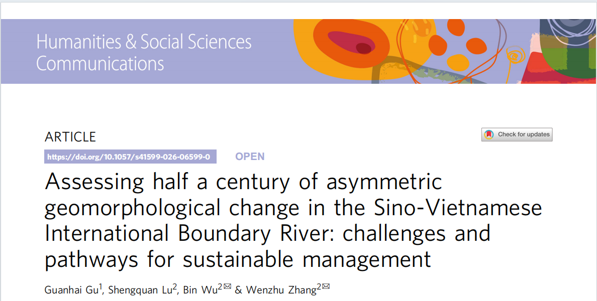 在Humanities and Social Sciences Communications发表了题为“Assessing half a century of asymmetric geomorphological change in the Sino-Vietnamese International Boundary River: challenges and pathways for sustainable management”的研究论文。论文提出了一种针对国际边界河流可持续管理框架,为国际边界河流复杂演变提供了新的定量证据。该文由吴彬副教授为通讯作者,硕士研究生顾观海为第一作者共同完成。