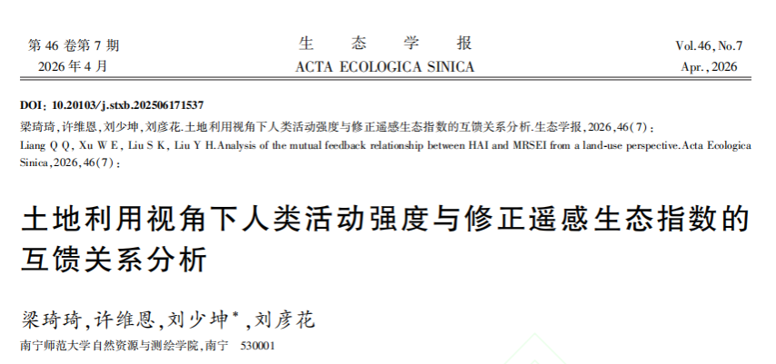 在《生态学报》(北大核心 CSCD)发表了题为“土地利用视角下人类活动强度与修正遥感生态指数的互馈关系分析”的研究论文,论文探究平陆运河经济带人类活动强度与生态环境质量之间的耦合作用关系,为平陆运河经济带后续开发经营过程提供科学依据。该文由刘少坤教授为通讯作者,硕士研究生梁琦琦为第一作者共同完成。