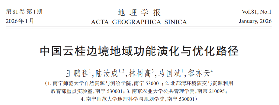 在《地理学报》(北大核心 CSCD EI检索)发表了题为“中国云桂边境地域功能演化与优化路径”的研究论文,论文构建“发展—安全”统筹视角下的边境地域功能评价体系,揭示云桂边境功能演化规律,提出分区优化策略,为边境地区可持续发展提供理论支撑与实践指导。该文由陆汝成教授为通讯作者,硕士研究生王鹏程为第一作者共同完成。