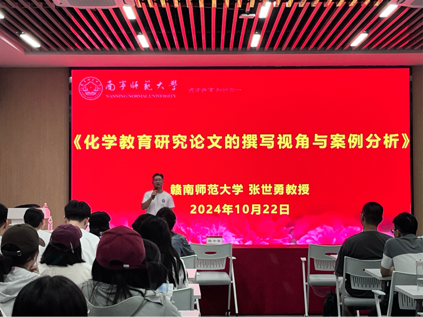 为进一步提升化学与材料学院人才培养质量,积极引导学生自主学习与科研创新,10月22日晚,化学与材料学院特邀赣南师范大学张世勇教授在我校武鸣校区大学生创新创业孵化园B19报告厅开展了《化学教育研究论文的撰写视角与案例分析》专题讲座,该讲座由化学与材料学院党委副书记陈今浩主持,2024级学科教学专业全体硕士研究生参会。