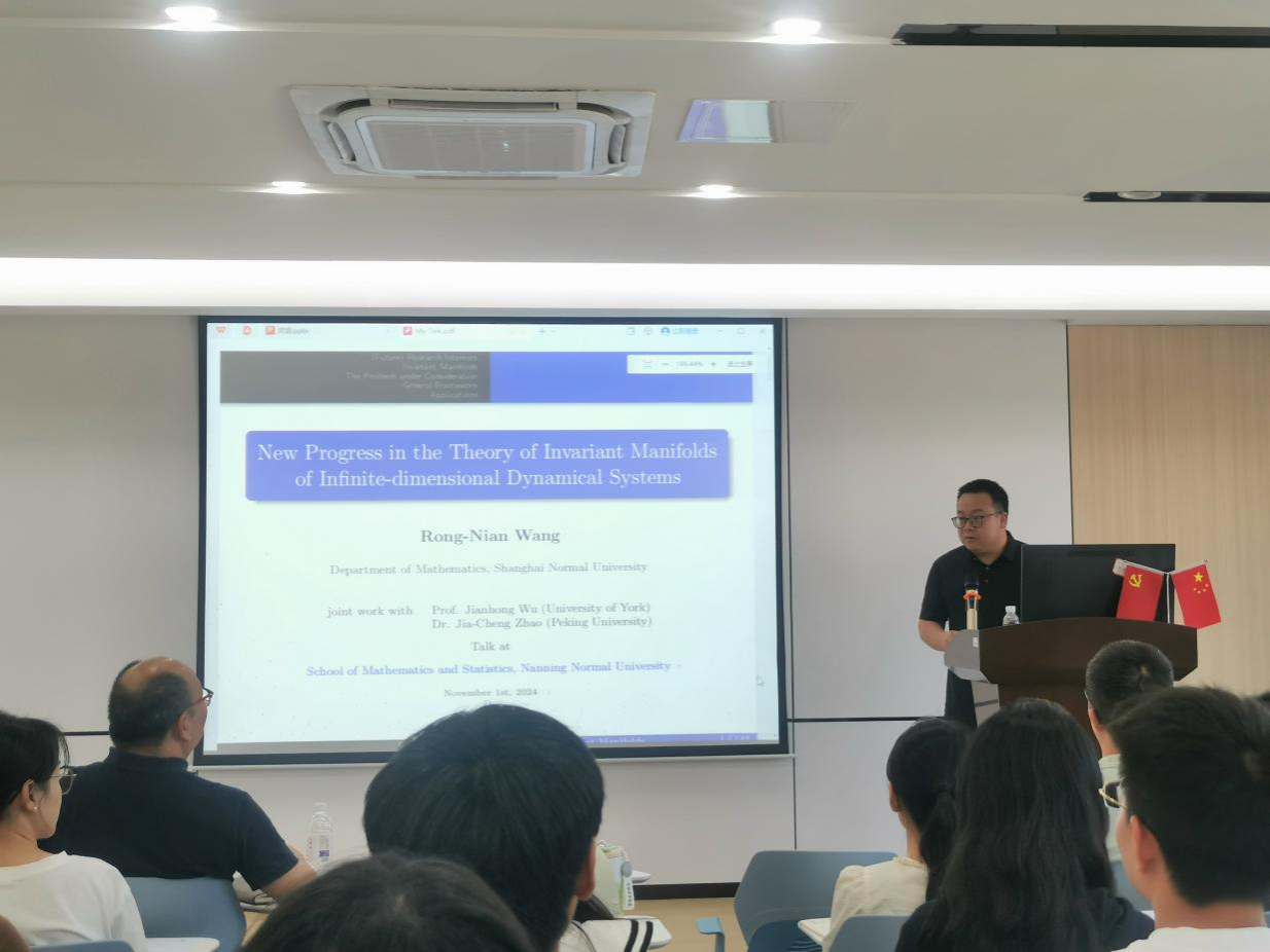 11月1日,应广西应用数学中心(南宁师范大学)的邀请,上海师范大学王荣年教授为数学与统计学院师生作了题目为《New Progress in the Theory of Invariant Manifolds of Infinite-dimensional Dynamical Systems》的学术报告,报告由学院院长黄在堂教授主持,部分老师及所有学术型硕士研究生参加了此次学术活动。