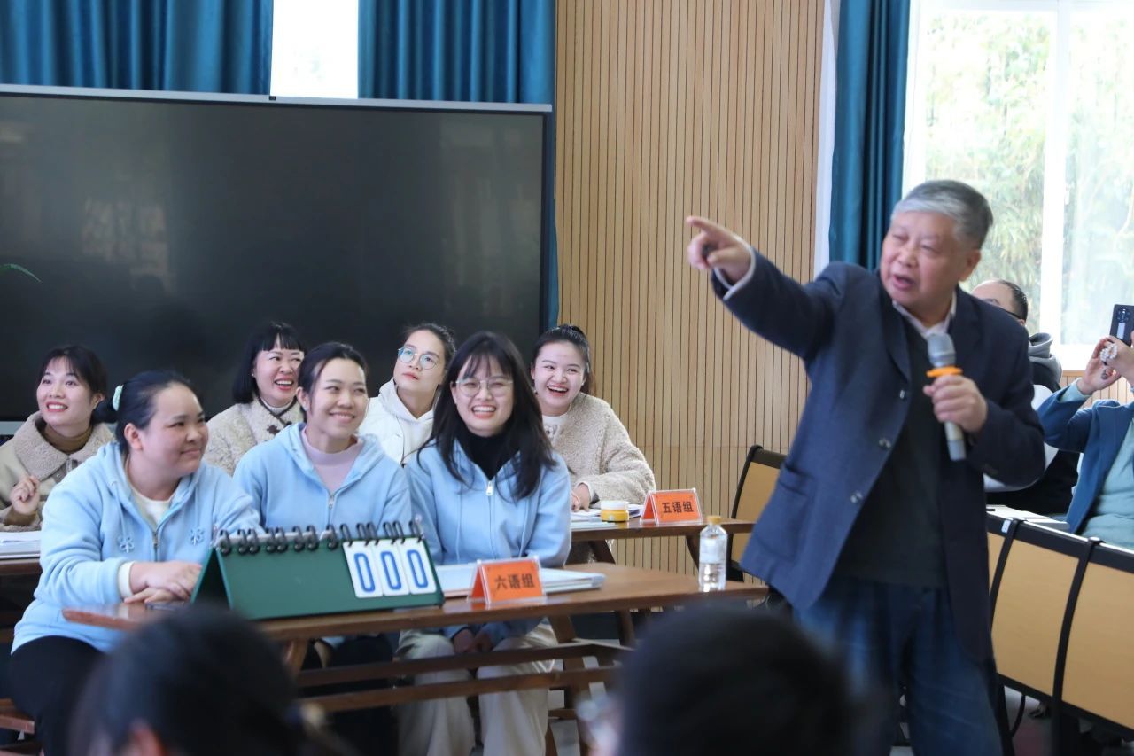 在随后的动态成果展示中,该校领导介绍工作室成立一年来校本研修的成果,该校学生用普通话和南宁白话并辅以表示平仄的手语作了生动有趣古诗吟诵表演。随后,黄亢美与三位小学生就自创的格律诗进行现场交流,通过对学生习作中诗歌写作的“一三五不论,二四六分明”和“犯孤平”等诗词术语的问答和交流,凸显了学生对诗词格律的理解。黄亢美还主持了六个年级组教师代表的汉字文化和诗联声律知识竞赛,他结合老师们的作答并随机地进行扩展讲解,把知识竞赛和专题讲学融为一体,吸引了与会老师们的极大兴趣,竞赛选手的精彩回答不时引发了掌声和赞叹的笑声。竞赛结束后,众多老师反馈说,“这种竞赛和讲学融为一体的方式真是别开生面,由于题目切合教学实际,弥补了不少自身的知识缺陷,真是收获满满!”