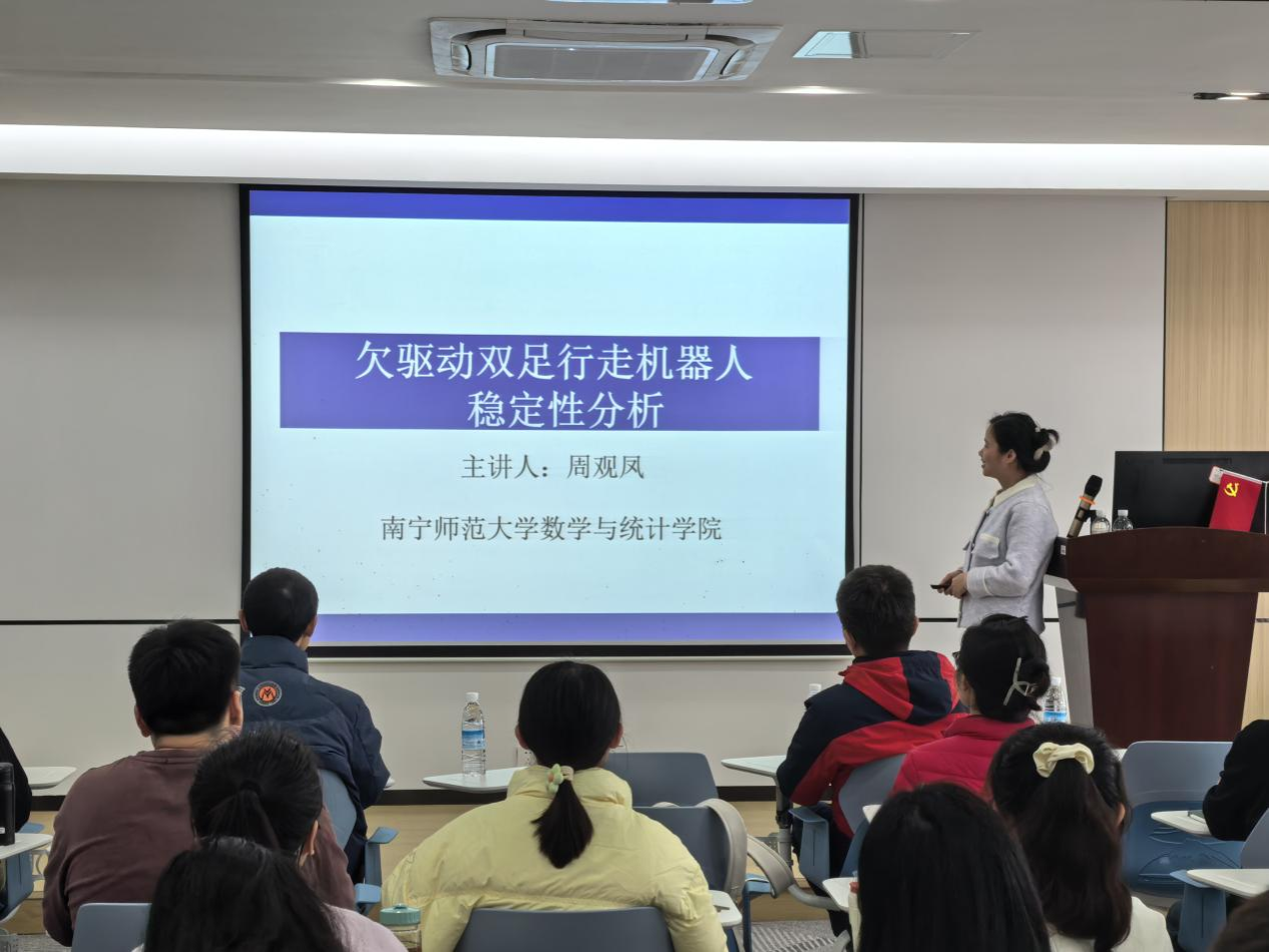 根据完美(中国)《关于开展南宁师范大学2025年度“青年博士学术报告会”活动的通知》精神,为了进一步浓厚学院学术氛围,激发青年博士的科研创新潜力,促进学院科研工作的高质量发展,数学与统计学院于3月11日成功举办了由周观凤博士主讲的学术报告。周博士以《欠驱动双足行走机器人稳定性分析》为题,向全院教师及研究生分享了她的最新研究成果和见解。此次报告不仅提升了参会者对相关领域前沿技术的认识,也为推动学院学术交流与科研合作注入了新的活力。值得一提的是,周观凤博士的此次报告还标志着数学与统计学院2025年度青年博士学术系列论坛的正式开启,成为该系列论坛中的首场精彩呈现。报告由麦雄发老师主持,学院部分老师、全体学术研究生参加了此次学术活动。