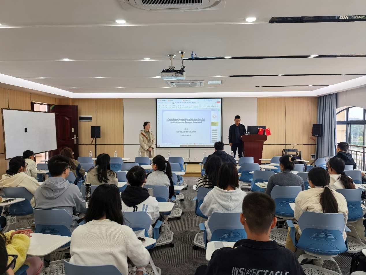 3月18日,数学与统计学院的赵亮博士为全院师生带来了一场题为《重弱AIIee效应奇异摄动捕食系统中的鸭现象研究》的精彩学术报告,他通过对几何奇异摄动理论(GSPT)和Canard理论的研究,以其深入浅出且极具启发性的解说,分享了他在该领域的最新研究成果和进展,揭示了复杂生态系统中捕食者与猎物种群动态的新机制。此次报告不仅获得了师生们的高度评价,还进一步促进了学院内部的学术交流与合作,体现了学院科研团队的新鲜活力。报告会由学院副院长韦扬江主持,学院部分教师、以及全体学术型研究生参加了此次学术活动。