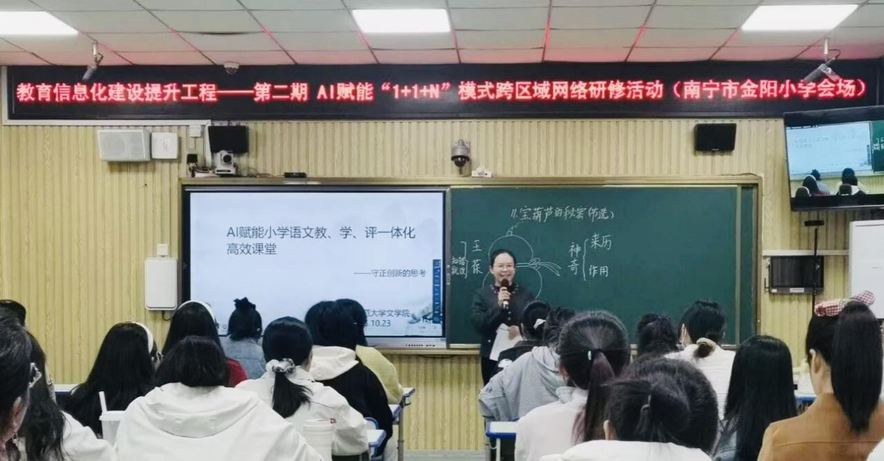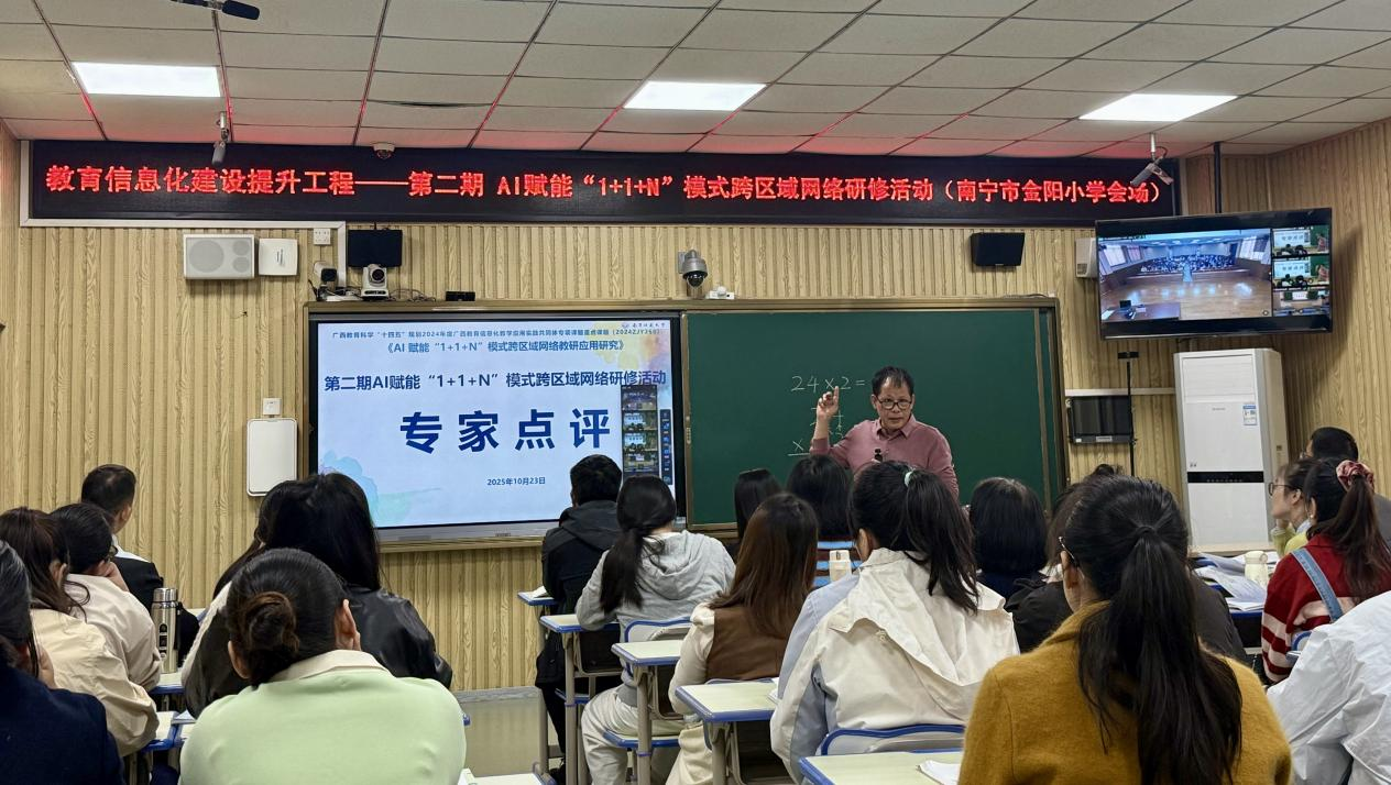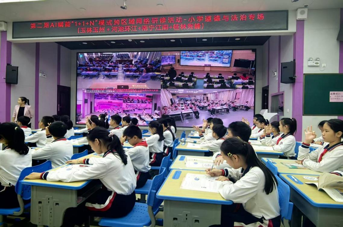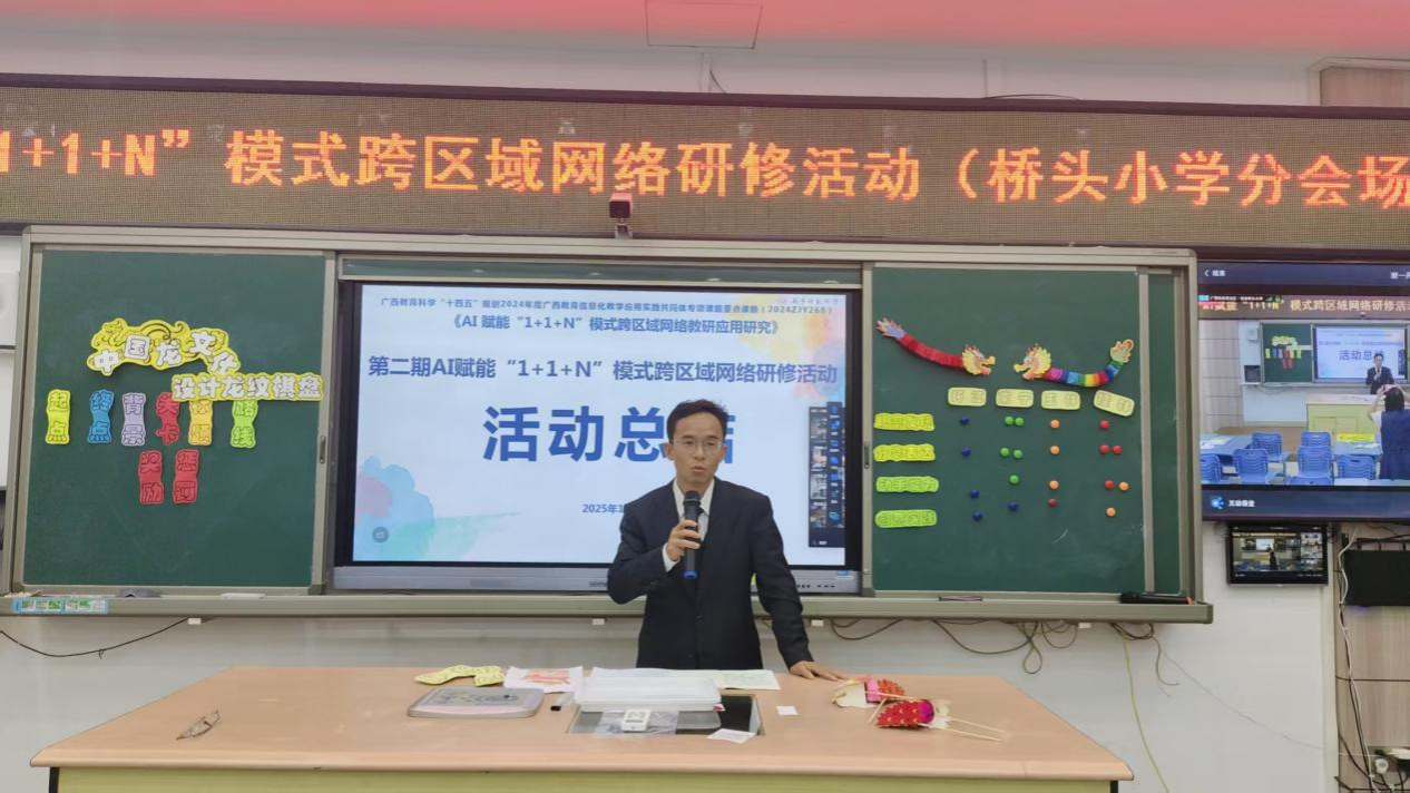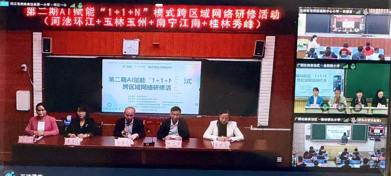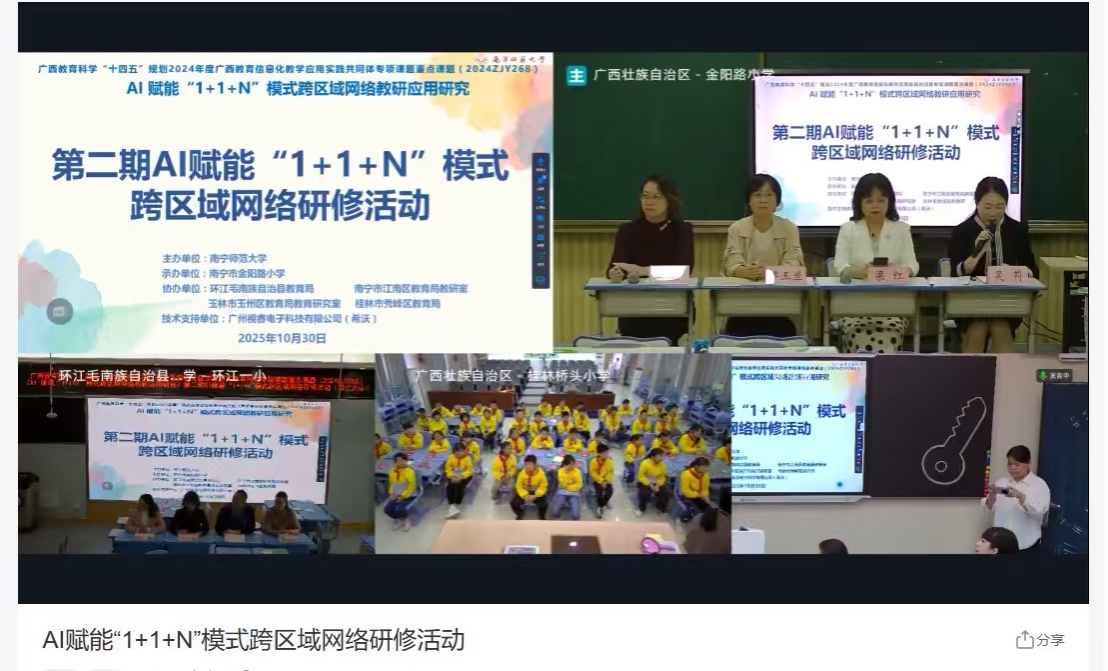 为推动区域间教育交流和优质教育资源共享,提升教师数字化技能与信息素养,推动科研项目研究成果的实践与服务基础教育,由南宁师范大学教育科学学院余朝文教授主持的“AI赋能‘1+1+N’模式跨区域网络教研应用研究”项目,于10月23日和10月30日开展了第二期网络研修活动,本次活动通过“1个主讲端课堂+3个听讲端课堂”的“1+N专递课堂”形式开展课前异地网络集体备课磨课、云端同步授课、四地学生听课互动、四地教师评课研讨、专家评课及专业微讲座等环节,深入研讨学科教学方法与技巧及AI在课堂教学中的实际应用路径,实现了跨区域间的教学沟通与协作。