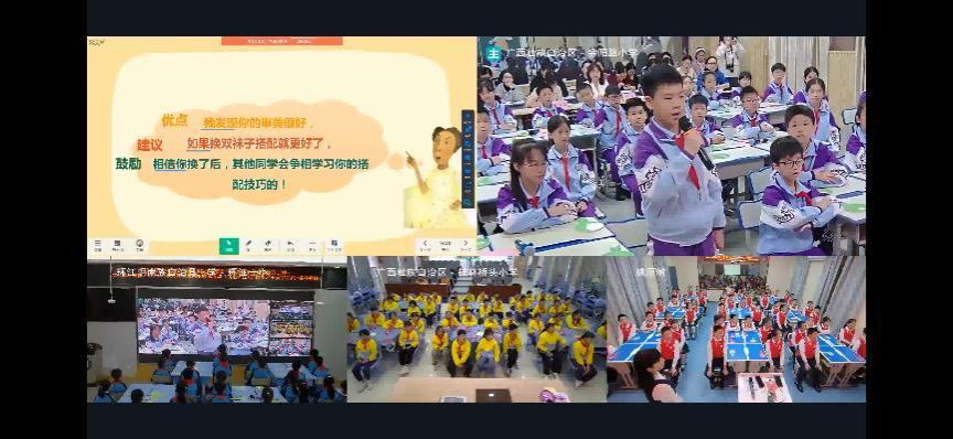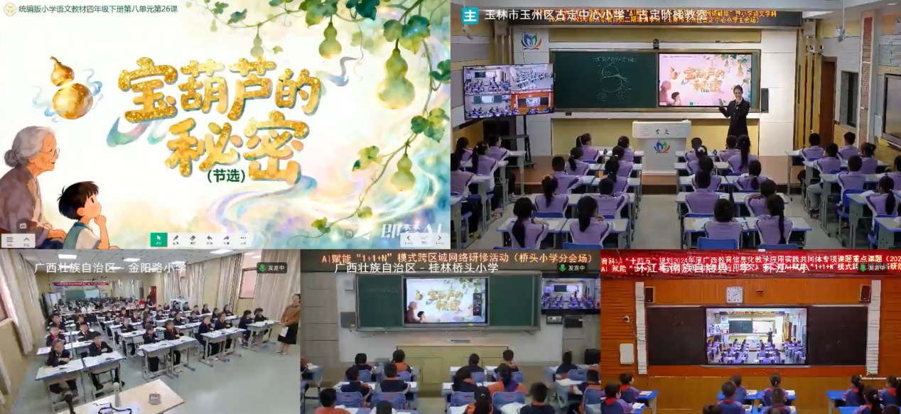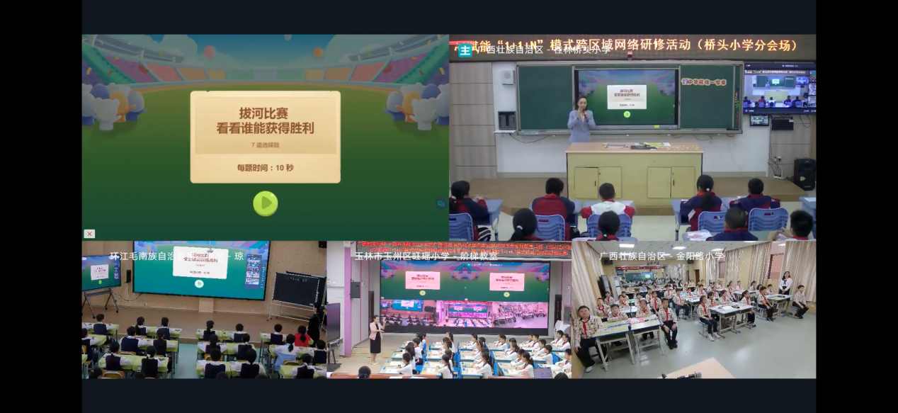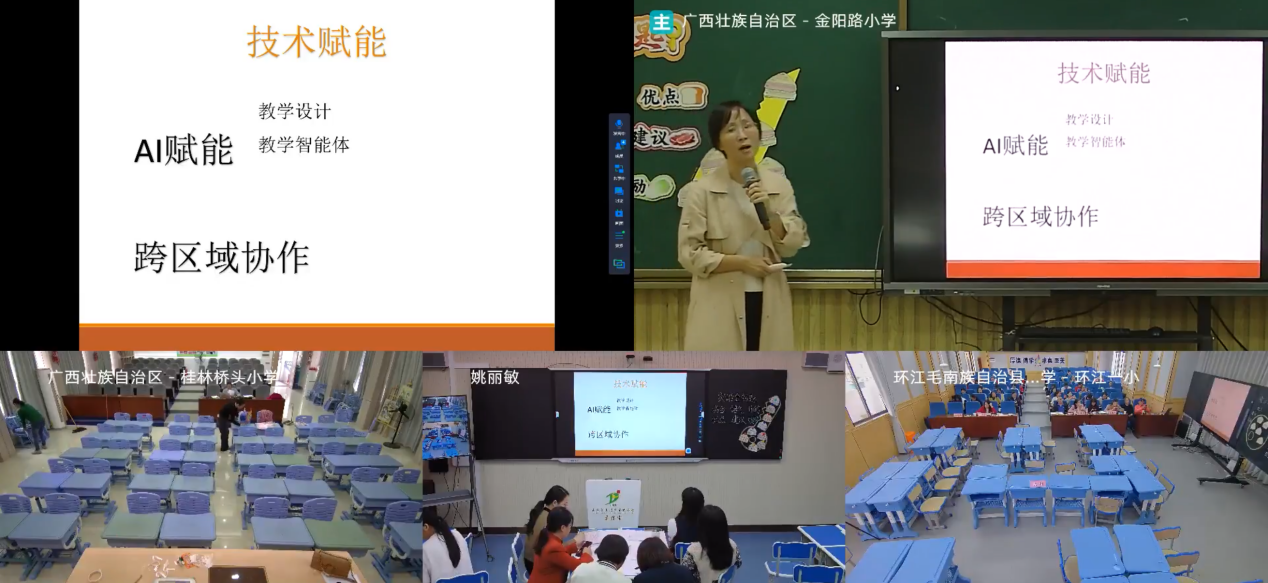 活动于10月23日上午由环江毛南族自治县第一小学作为授课主讲端进行小学数学的课例展示,下午由玉林市玉州区古定中心小学作为授课主讲端进行小学语文的课例展示,10月30日上午由南宁市金阳路小学作为授课主讲端进行小学心理健康的课例展示,下午由桂林市秀峰区桥头小学作为授课主讲端进行小学思政、小学美术的课例展示。四地小学教师聚焦数学、语文、心理健康、思政、美术5节课5个学科共16个班级参与,通过云端集体备课打磨课例、课例展示、组织学生云端参与课堂互动,不仅展示了AI技术与各学科教学相融合的阶段性成果,也改进了传统教育在时间和空间上的束缚。课例展示结束后,四地教师借助云端实时共享技术,围绕学生学科核心素养的提高和AI技术与学科教学紧密融合等方面对展示的课例进行点评。