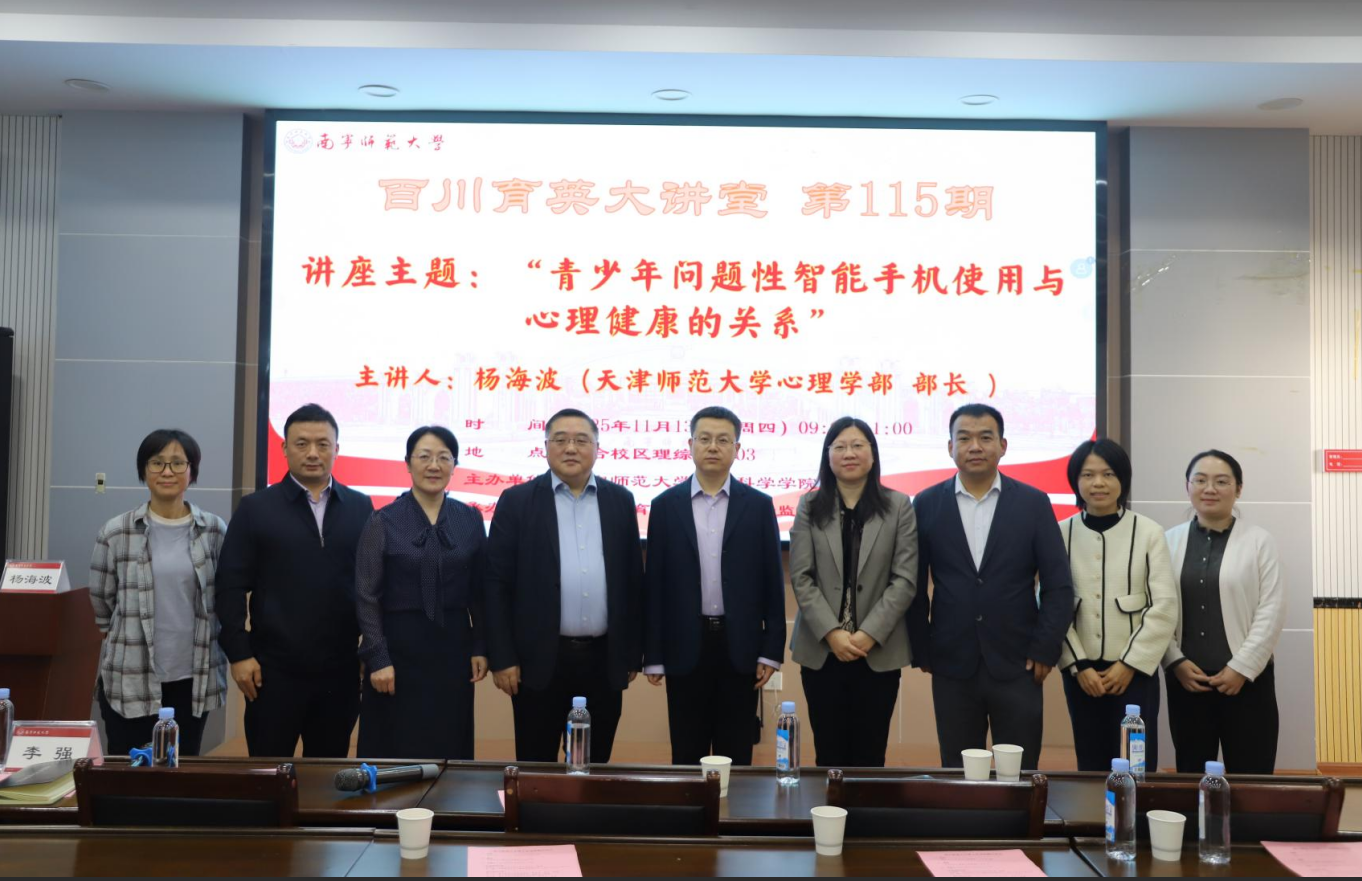 为探讨智能时代手机使用对青少年的现实影响、分享心理学相关研究成果,搭建学术研究与教育实践的衔接平台,11月13日,由南宁师范大学教育科学学院主办、广西教育现代化与质量监测研究中心承办的《百川育英大讲堂》第115期讲座在五合校区理综楼1003室顺利举行。本期讲座特邀天津师范大学心理学部部长杨海波教授,以“青少年问题性智能手机使用与心理健康的关系”为题展开分享,由南宁师范大学教育科学学院院长李强教授主持。
