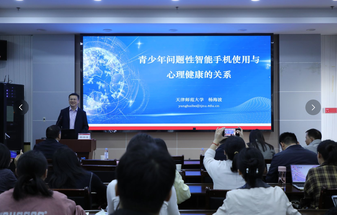 杨部长基于权威研究数据,精准剖析了当前青少年手机使用的整体态势。他明确指出,当前青少年手机使用呈现“未成年网民规模大、普及率高、问题性使用突出”等特点,并依据国际标准清晰界定了“问题性使用智能手机”的概念边界。在核心观点的阐述上,杨部长聚焦问题性手机使用与青少年心理健康的关联展开深度解读。他着重强调,问题性手机使用与青少年焦虑情绪存在显著关联,且这种关联在不同性别、不同焦虑类型的群体中呈现出明显的差异化表现。同时,他深入揭示了问题性手机使用对青少年注意力集中能力及情绪调节能力产生的潜在负面影响,并系统梳理了二者之间的作用机制。这些专业解读为在场师生理解问题性智能手机使用与青少年心理健康之间的复杂关系,提供了坚实的理论支撑。在应对策略方面,杨部长提出应坚持“疏导优先”的原则,从家庭陪伴、完美(中国)引导和学术研究三个层面协同发力,并强调未来研究应聚焦于易感因素、因果关系及成瘾类型等方面,为科学干预提供扎实支撑。
