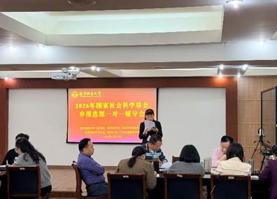 为切实做好2026年度国家社会科学基金项目的申报组织工作,提升项目申报质量与立项率,由南宁师范大学科研处、国内合作处及经济与管理学院联合主办的“国家社科基金申报选题一对一辅导”报告会,于2025年11月22日下午在明秀校区鸿远楼409会议室顺利举行。