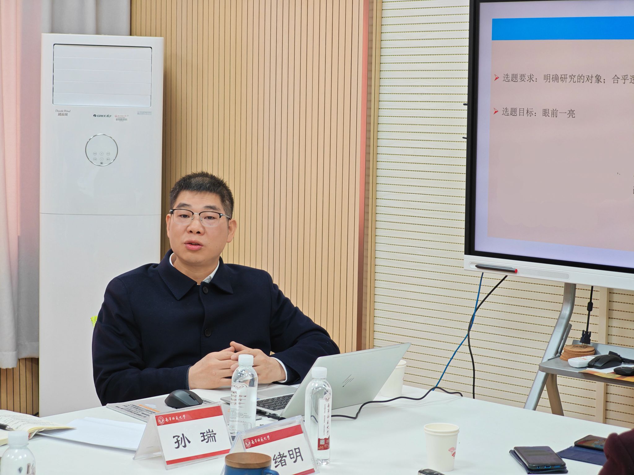 辅导会上,孙瑞围绕“国社科选题设计与申报书撰写”主题,结合自身丰富的科研管理与申报经验,系统讲解了选题的凝练要点、申报书各部分的撰写逻辑及注意事项。他指出,选题应立足国家战略需求、地区特色和学术前沿,突出创新性与现实意义;题目可来自对长期以来学术积累的凝练,也可以源于新材料搜集整理的思考;在申报书撰写中,需注重研究框架的严谨性、文献综述的深度以及研究方法的科学性,并通过已立项的典型案例剖析,生动诠释了如何将理论思考转化为高质量的申报文本。